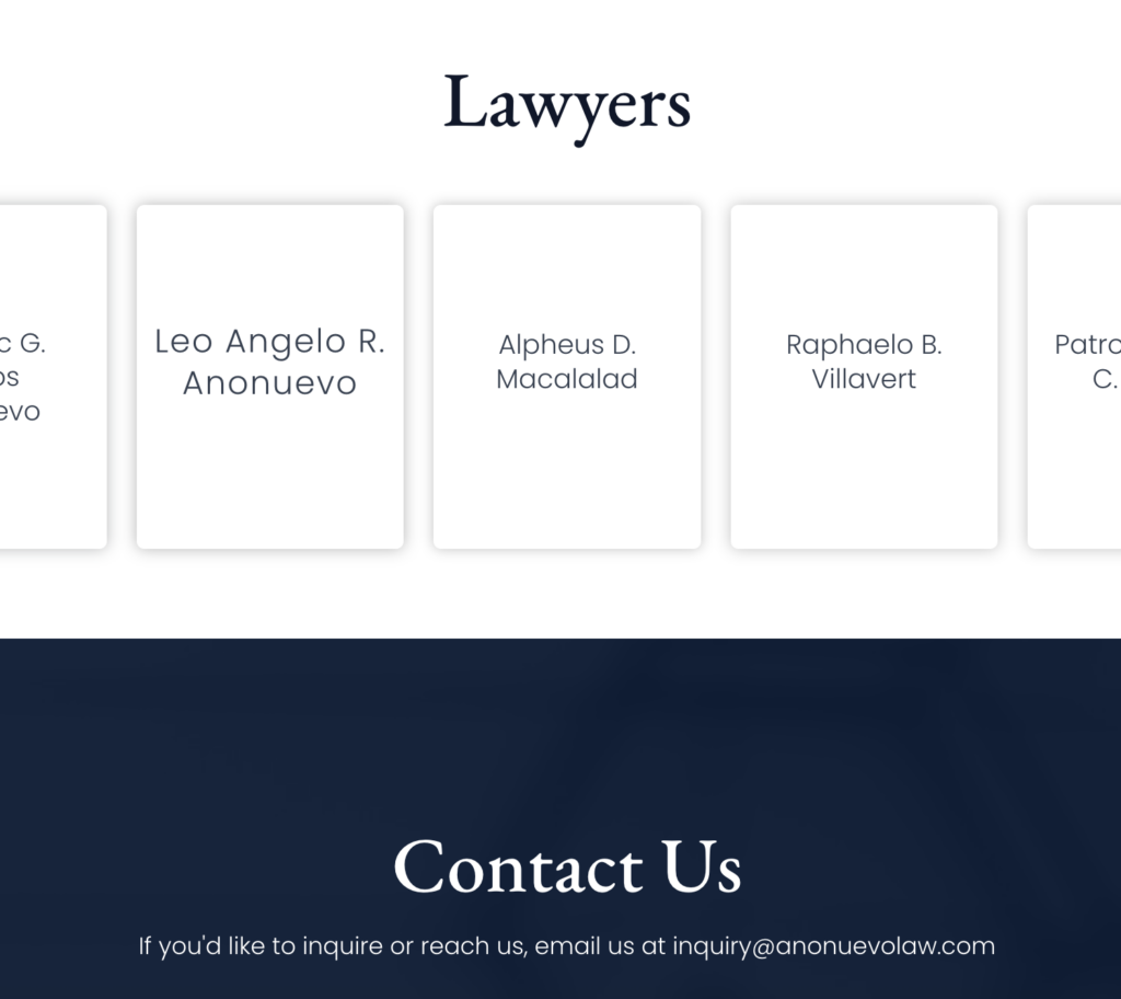 Law Firm Website Design UX/UI Designer | WordPress | https://anonuevlolaw.com Designed and conceptualized a one page website for a law firm, Anonuevo Law Office. Their directive was a straightforward, informative and minimal homepage, no frills.